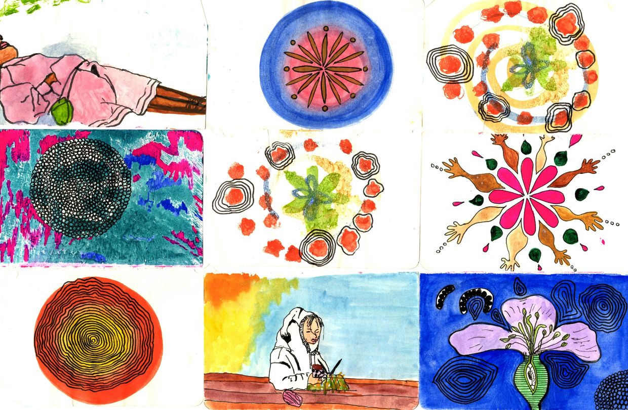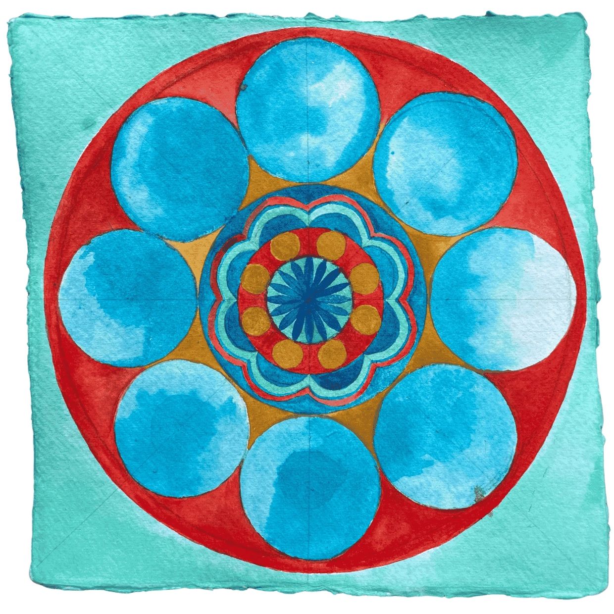 Painted during one of the darkest and coldest times of year in London, this mandala is a celebration of our inner flame. Agni is the Hindu god of fire, acting as a messenger between the human and the spiritual realms and exists at three levels, on earth as fire, in the atmosphere as lightning, and in the sky as the sun.